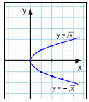 y = ±Med andra ord så finns det två värden på y för varje x vi väljer. Vi är dessutom begränsade till att endast välja positiva värden för x eftersom vi inte kan dra kvadratroten ur ett negativt tal. Nedan kan du se tabellen med värden och grafen.