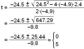 Verdien t ≈ 0 er ikke helt nøyaktig, fordi pilen allerede er 2,4 m over bakken når vi begynner å ta tiden. Den andre t - verdien forteller oss at pilen treffer bakken etter 5 sekunder.