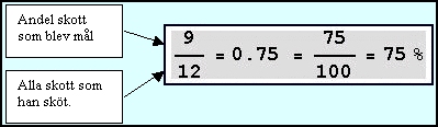 Staffan Olsson sköt 12 skott på mål i en handbollsmatch. Han gjorde 9 mål och 3 gick i stolpen. Hur stor andel av skotten blev mål i procent ?