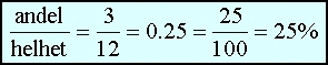 Vi ser att en del av en hel kan skrivas som bråk, som en bild eller i procent %. Det här använder vi oss av när du räknar ut procent.