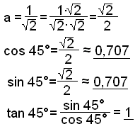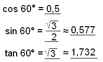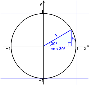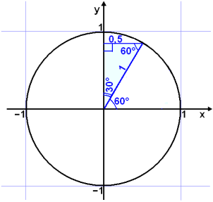 Viš fįum aftur žrķhyrning meš 30°, 60° og 90° hornum og getum nżtt okkur śtreikningana hér fyrir ofan. Nś hefur sķnus tekiš gildi kósķnuss og öfugt. |