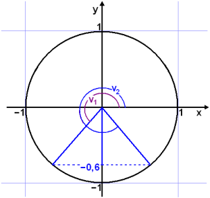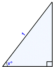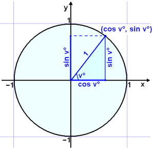Teiknum horniš v° ķ hringinn žannig aš annar armur žess verši į x-įsnum og hinn myndi radķus hringsins (meš lengdina 1) eins og myndin sżnir. Žį kemur fram žrķhyrningur meš langhlišina 1 žannig aš skammhlišarnar eru cos v° og sin v°. Viš sjįum aš hornpunkturinn į hringnum hlżtur aš hafa hnitin (cos v°, sin v°).