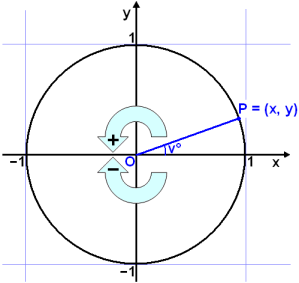 Žessar athuganir okkar į hornaföllum ķ einingarhringnum gilda fyrir horniš v° sem liggur upp og til vinstri frį x-įsnum. Hugsum okkur horniš v° verša til viš snśning um nśllpunktinn į žeim armi hornsins sem ekki er į x-įsnum. Žessi stefna (upp og til vinstri eša rangsęlis) er skilgreind sem jįkvęšur snśningur og gagnstęš stefna sem neikvęšur snśningur. Fęrsla punktsins P upp og til vinstri frį x-įsnum eftir einingarhringnum er jįkvęšur snśningur (sjį mynd).