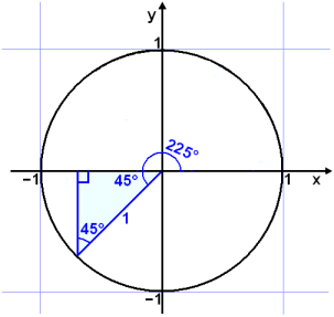 Žetta er 45° meira en 180° (45° + 180° = 225°). Viš fįum žvķ eftirfarandi žrķhyrning: