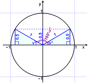 Ķ dęminu er gefin hęšin 0,5 upp eftir y-įsnum (sin v° = 0,5). Viš žurfum sem sagt aš finna hvaša tvö horn koma fram žar sem lįrétt lķna ķ hęšinni 0,5 sker einingarhringinn (sjį brotnu lķnuna į myndinni). Viš getum teiknaš tvo eins žrķhyrninga sem bįšir hafa horniš v° (= 30°) og mótlęga hliš 0,5 (= sin 30°). Horniš sem reiknivélin fann er minnsta horniš frį jįkvęša x-įsnum en žaš er bara annaš svariš. Hitt svariš er v° (eša 30°) til baka frį stefnu neikvęša x-įssins eša 180° − 30° = 150°.