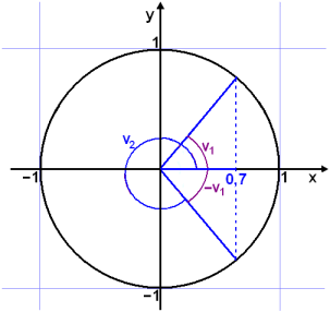 Gefiš er aš fjarlęgšin frį y-įsnum er 0,7. Lóšrétt lķna ķ gegnum 0,7 sker einingarhringinn į tveimur stöšum. Reiknivélin gefur cos −1(0,7) ≈ 45,57°. Viš sjįum nś af myndinni aš hinn skuršpunkturinn kemur fram ķ −45,57° og til žess aš fį jįkvęša grįšutölu žurfum viš aš bęta viš 360°.