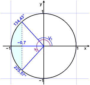 Leysum ójöfnuna cos v° < −0,7 į bilinu 0° £ v° < 360°.