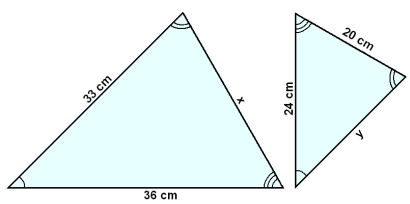 Þríhyrningarnir á myndinni eru einslaga og jafn stór horn eru merkt eins. Finnum hliðarnar x og y.