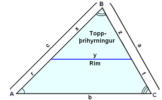 Þríhyrningur hefur tvær hliðar 30 cm langar og 42 cm langa grunnlínu. Teiknuð er rim í 10 cm fjarlægð frá grunnlínunni. Finnum hve löng rimin er.