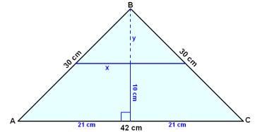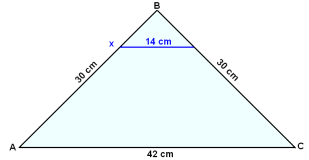 Þríhyrningurinn ABC hefur tvær hliðar sem eru 30 cm langar og 42 cm grunnlínu. Dregin er rim sem er 14 cm löng samsíða grunnlínunni. Finnum hvernig rimin skiptir 30 cm hliðunum (finnum XB og Ax).
