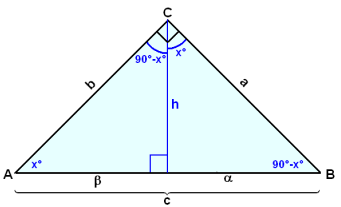 Hæðin skiptir 90° horninu í tvennt. Við skulum kalla annan hlutann x°, en hinn hlutinn verður þá 90°− x°. Við sjáum þá að hornin við grunnlínuna sitt hvoru megin verða að vera 90° − x° hægra megin og x° vinstra megin ef þríhyrningarnir eiga að hafa samtals 180° hornasummu.