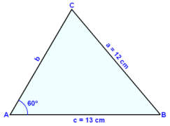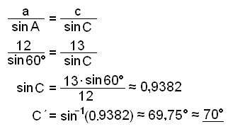 Í gleiğhyrndum şríhyrningi er hliğin a = 12 cm, hliğin c = 13 cm og horniğ A = 60°. Finnum horniğ C, hliğina b og flatarmál şríhyrninngsins.