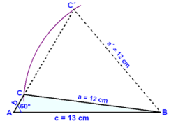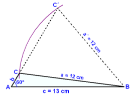 Viğ teiknum fyrst upp 13 cm grunnlínu og 60° horn viğ annan endann sem viğ köllum A. Hinn endann köllum viğ B. Şar stingum viğ niğur sirkli og teiknum hring meğ radíus 12 cm. Hann sker arm 60°hornsins A á tveimur stöğum og viğ veljum şann möguleika sem gefur gleiğhyrndan şríhyrning (sem er litağur á myndinni).