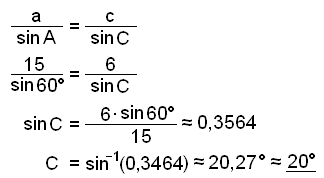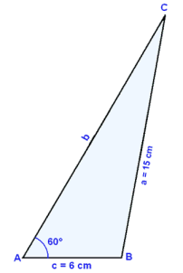 Í gleiğhyrndum şríhyrningi er hliğin a = 15 cm, hliğin c = 6 cm og horniğ A = 60°. Finnum horniğ C og hliğina b.