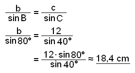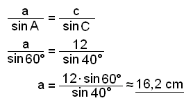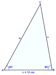 Í şríhyrningi er hliğin c = 12 cm og horniğ A = 60° og horniğ B = 80°. Finnum hliğarnar b og c.