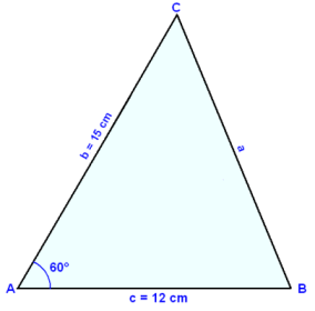 Í şríhyrningi er hliğin c = 12 cm og hliğin b = 15 cm. Horniğ A á milli hliğanna b og c er 60°. Finnum hliğina a, horniğ C og flatarmáliğ.