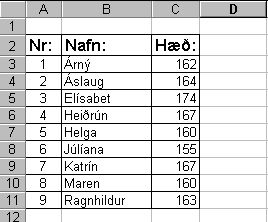 Þú breikkar nafnadálkinn (dálk B) með "Format Column width" í 15. Þú mjókkar dálkinn með númerunum (dálk A) með "Format Column width" í 4,4 og hafðu dálkinn með hæðarmælingunum ( dálk C) með breiddina 5. Að lokum setur þú inn sterkar útlínur á reitina með "borders" veldu svarta rúðunetið. |