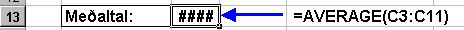 Þannig er formúlan " =AVERAGE(C3:C11)" jafngild formúlunni "=SUM(C3:C11)/9" eða summan deilt með fjöldanum.
