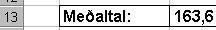 Þá sjáum við hið raunverulega gildi í reit C13 eða töluna 163,6 sem er meðaltal talnanna í dálk C. Þú veist væntanlega að meðaltal mælinga fæst með því að leggja þær allar saman og deila í með fjölda þeirra.