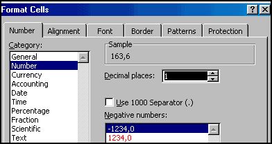 Velja síðan "Format Cells" og velja "Number" og setja einn aukastaf, "Decimal places" velja þar töluna 1. |