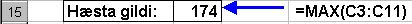 Nú smellir þú í reit C15 og ritar formúluna =MAX(C3:C11). Tölvan leitar nú að því gildi sem er hæst í talnasafninu sem þú valdir. Niðurstaðan fer í reit C15.
