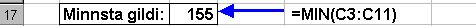 Nú smellir þú í reit C17 og ritar formúluna =MIN(C3:C11). Tölvan leitar nú að því gildi sem er lægst í talnasafninu sem þú valdir. Niðurstaðan fer í reit C17.