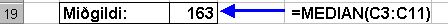 Nú smellir þú í reit C19 og ritar formúluna =MEDIAN(C3:C11). Tölvan leitar nú að því gildi sem er staðsett í miðri röðinni. Þú serð ef þú skoðar töfluna að tölurnar eru 9. Þegar þú ert búin(n) að raða þeim í vaxandi röð minnstu fyrst og stærstu síðast þá er að leita að tölunni sem er í miðjunni en það er talan sem er fimmta talan í röðinni ( Ragnhildur manneskja númer 9 en með hæðargildi númer 5 ).