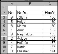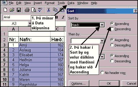 Fylgdu nú fyrirmælunum hér að ofan. Þú blokkar töfluna án þess að taka fyrrisagnirnar með og velur skipunina "Data" hakar síðan við skrunlínuna í "Sort by" og leitar að fyrisögnini Hæð. Nú velur þú vaxandi röð eða Ascending ( lægstu gildin fyrst og hæstu gildin síðast).