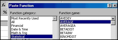 Þessi stærðfræðiföll eru flokkuð eftir ýmsum greinum og verður kíkt á þau í seinni köflum þessa kennsluefnis. Hér fyrir ofan sérð þú t.d. meðaltalsfallið ( Average) undir flokknum tölfræði (Statisical). |