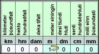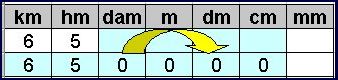 Hvaš eru 6,5 kķlómetrar margir sentimetrar ? Viš setjum 6,5 inn ķ talnahśsiš 6 undir sętiš km og 5 ķ nęsta sęti viš hlišina.