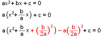 Her legger vi til (og trekker samtidig fra) halve koeffisienten til b, opphøyd i annen. Så kan vi bruke formelen p2± 2pq + q2 = (p ± q)2 |