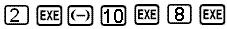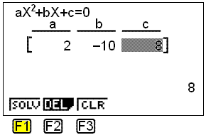 Vi setter inn verdiene a = 2, b = −10 og c = 8 ved å trykke EXE mellom hvert tall.
