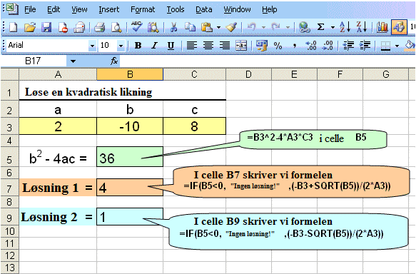 Skriv inn a, b og c in cellene A3, B3 og C3.