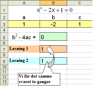 Hvis vi bruker programmet til å løse en likning med bare en løsning, som for eksempel x2 − 2x + 1 = 0, får vi det samme svaret to ganger.