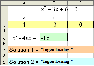 x2 − 3x + 6 = 0 vil EXCEL vise dette: